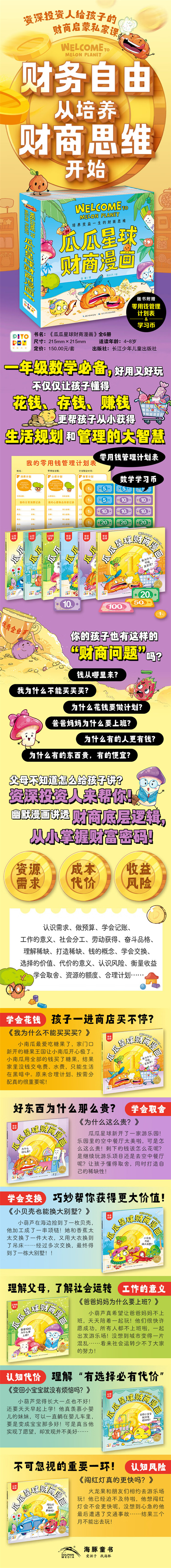 你还在把财商和 “会管钱”划等号吗?从小培养孩子的财商思维才是王道!财商思维能帮助孩子在金钱使用以及生活方方面面都能做好规划和管理。 《瓜瓜星球财商漫画》是资深投资人写给孩子的趣味财商漫画,充分把握4~8岁儿童财商培养关键期,从小建立财商思维。故事以瓜瓜星球居民的日常生活为出发点,通过贴近孩子日常生活、轻松有趣的漫画故事,在潜移默化中让孩子建立财商相关的概念!这套书除了让孩子自己懂得怎样花钱、存钱、管钱、赚钱,更能让孩子建立起完整的财商思维模型,掌握正确的财富观、消费习惯和理财技能,培养驾驭金钱、生活规划管理的能力和智慧,为拥有富足、幸福的人生奠定基础。随书还附赠财商知识点、数学学习币、零用钱管理计划表,让孩子在玩中轻松获得财商思维!