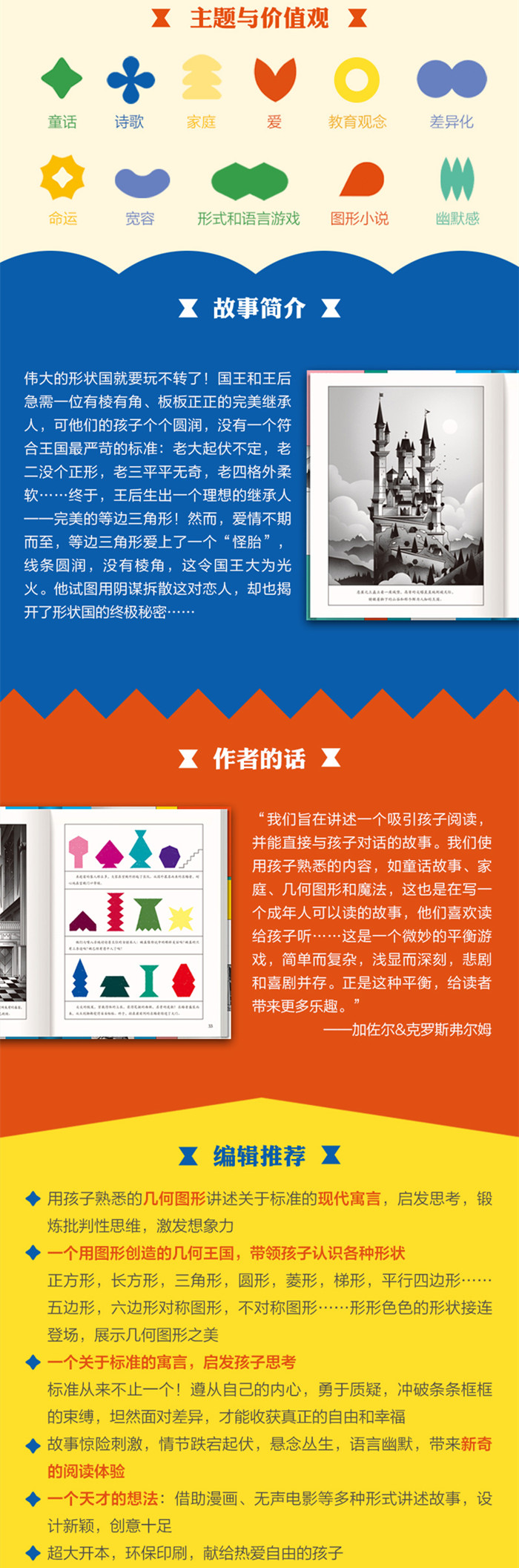 伟大的形状国就要玩不转了!国王和王后急需一位有棱有角的完美继承人,可他们的孩子个个圆润,没有一个符合标准:老大起伏不定,老二没个正形,老三平平无奇,老四格外柔软……终于,王后生出一个理想的继承人——无懈可击的等边三角形!上至国王和王后,下至臣民,都对完美的等边三角形寄予厚望。然而,爱情不期而至,她的意中人却处处“不完美”。她能冲破严苛规矩的束缚,收获幸福和自由吗? 主题与价值观:童话/诗歌/家庭/友情/教育观念/差异化/命运/宽容/形式和语言游戏/图形小说/幽默感 这是一个用几何图形创造的形状王国,带领孩子认识各种形状,领略几何图形之美。 这是一则关于标准的寓言,启发孩子思考,让孩子明白:标准从来不止一个!遵从自己的内心,冲破条条框框的束缚,收获幸福。 这是一个惊险刺激的童话故事,情节跌宕起伏,悬念丛生,传递爱和自由的力量。 插图用各种几何图形拼接而...