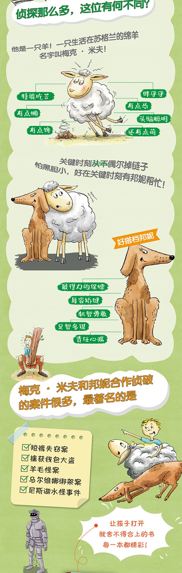 《小羊侦探》共分为5册,故事幽默搞笑,悬念迭起,人物塑造性格鲜明,讲述了小羊梅克·米夫和他亲爱的小主人的故事。 生活在奥利凡特农场的梅克·米夫是一只苏格兰高地绵羊,他有点馋、有点懒还有点胆小,最害怕的就是邻居老艾丁伯格和剪羊毛,但同时他也是对小主人忠心耿耿,总能查明真相、解决案件的大侦探。他和好朋友牧羊犬邦妮一起出马,识破了农场里的大盗,抓住运动会上的小偷,营救出被绑架的小表妹,勇闯闹鬼的城堡,揭穿尼斯湖水怪的骗局……当然,这些都不算什么,对深藏不露的“超级小羊”梅克·米夫来说,没什么比吃饱肚皮躺在草地上晒太阳,让小主人芬恩挠痒痒更幸福的事了。 这是一套适合低中年级小学生自主阅读的故事性读物。每个故事以紧凑动人的探案情节,生动有趣的人物形象,激发孩子的好奇心和探索欲,和小羊梅克·米夫一起去探案,去冒险,孩子们可以收获正义、勇敢、有爱、有担当的好品格,...