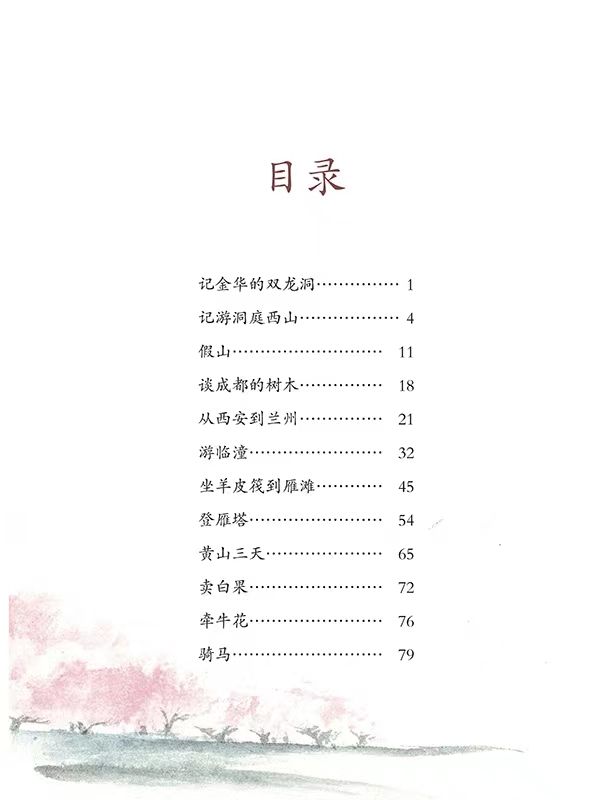 本书是“课文作家作品系列”中的一本,收录了叶圣陶先生的若干篇散文,其中包括写景的游记如《记金华的双龙洞》《记游洞庭西山》《谈成都的树》《从西安到兰州》《登雁塔》等;写实散文如《在西安看的戏》《寒晓的琴歌》《荣宝斋的彩色木刻画》等,以及写意的《牛》《牵牛花》等,共17篇经典散文作品,其中《记金华的双龙洞》被选入统编语文教材四年级册。 本书目录按照写景、写意和写实的顺序排序,在此基础上,又按照发表时间来排序。叶圣陶的散文作品内容丰富,文笔精巧、语言幽默、内蕴深厚、风格恬淡,选文非常适合四年级学生阅读。
