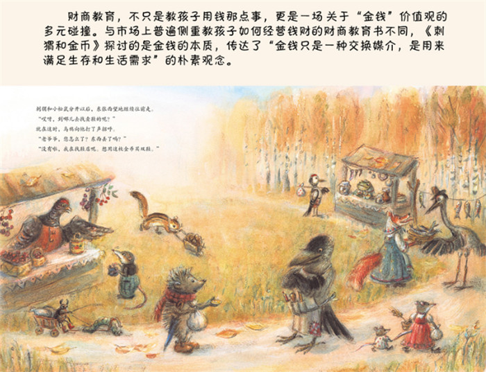 这是一本与孩子探讨金钱观的童话故事绘本。刺猬爷爷在森林小路上发现了一枚金币。因为上了年纪,准备过冬的食物很费劲,他就想用这枚金币买点吃的用的。可没想到转来转去也没找到商店,反而在旅途中得到了各种小动物无私的帮助。小松鼠送给他笋干,乌鸦给他做了双新鞋,蜘蛛给他织了双新袜子,而小熊宝宝给她带了一罐蜂蜜。被小动物们温暖的刺猬爷爷最后决定把金币放回原来的地方,留给真正需要它的人。