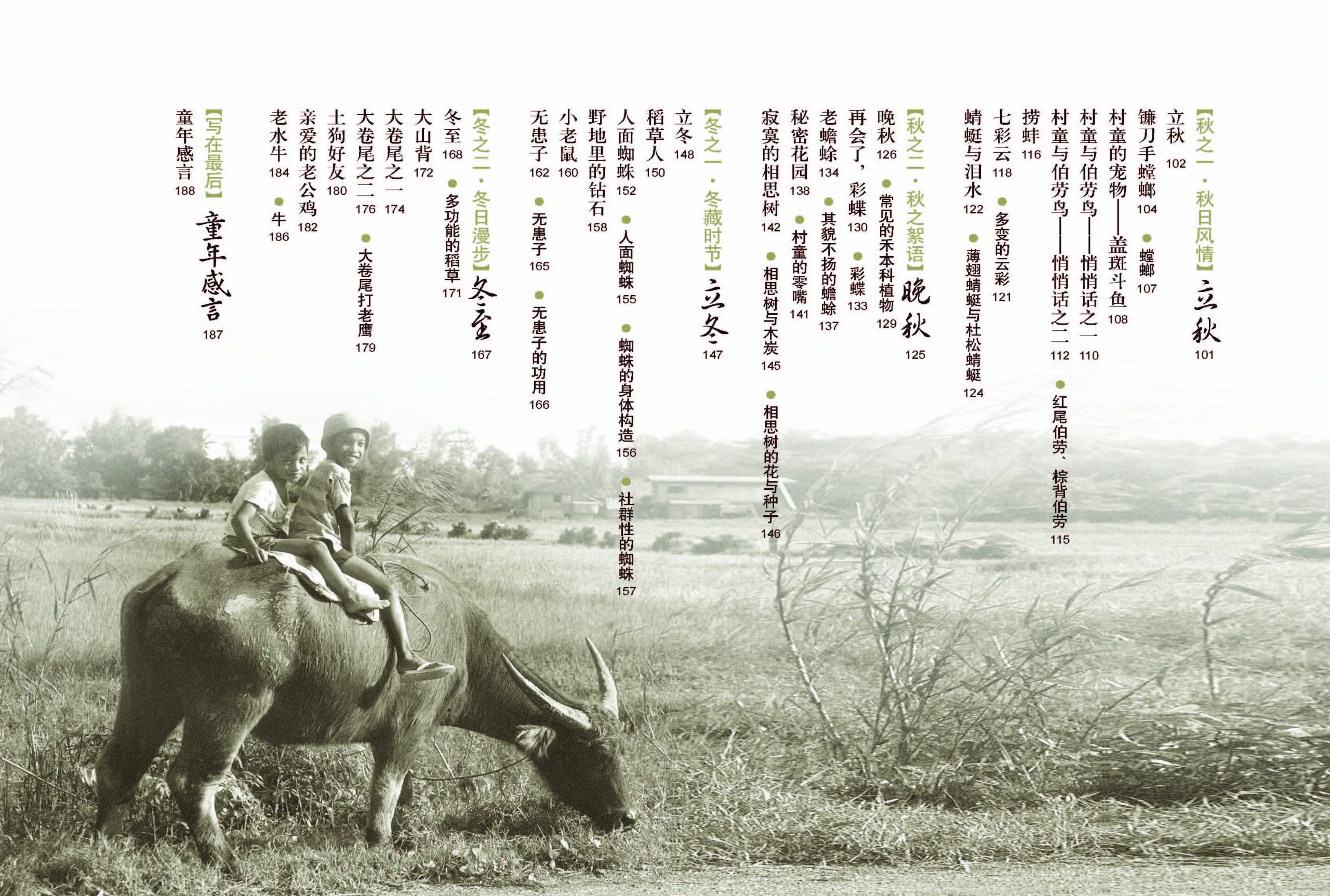 我写《村童野径》正是分享我的童年经验,这大约是50年代,那时我正是顽皮、好奇又有点叛逆的十岁村童。有着做不尽的农事以及写不完的功课,是所有村童的苦恼,结伴上山下河是最大的快慰。我们熟悉每一条大小溪流、每一座或高或低的山丘、每一条野径以及每一个有野果的角落……我们更清楚出现在生活场景中的各种动物、植物,无论它们是野生、饲养或栽植……