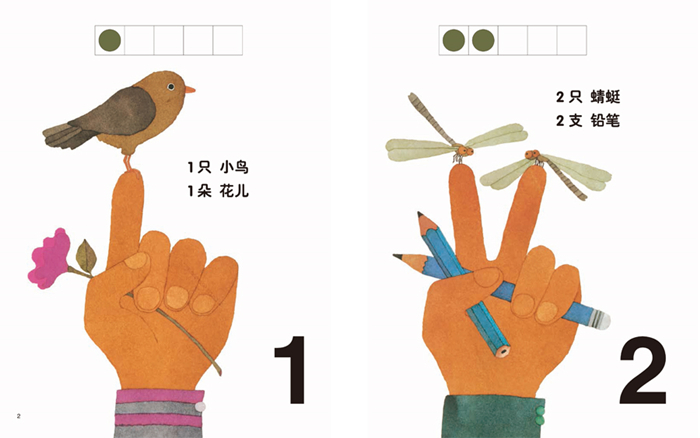 从1数到100:1 只小鸟,1 朵花儿;2 只蜻蜓,2 支铅笔;3 个手偶, 3 颗糖果;4 只蝴蝶, 4 张车票;5 只蝗虫, 5 个手环……