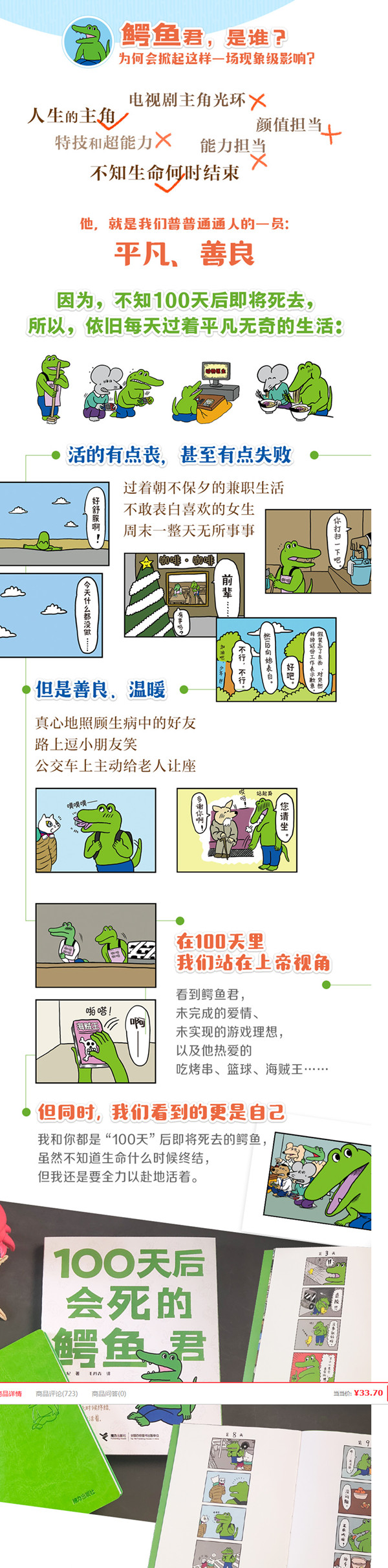 2019年12月12日,日本漫画家菊池佑纪开始在推特上上传一组漫画,记录了一只鳄鱼平凡的100天生命倒计时。平淡的日常,没有任何预告的生命结束点,这只鳄鱼的100天真实存活在了每个人的生命里,这组漫画点击率累计已超1000万。截至现在,作者这组漫画点击率累计已超1000万,3月20日鳄鱼生命结束当天,推特上带话题讨论超过2亿次,高居热度排行榜全世界第一位。 2020年5月,《100天后会死的鳄鱼君》在日本出版后引起了巨大反响,销量突破40万册。2020年10月,接力出版社将正式出版简体中文版《100天后会死的鳄鱼君》,邀请北京大学客员教授、著名旅日作家毛丹青先生翻译这部漫画,毛丹青先生原汁原味的翻译,带读者体会日漫角色语言的生动含义。