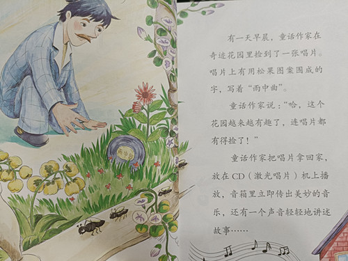 有一天早晨,童话作家在奇迹花园里捡到了一张唱片。唱片上有用松果图案围成的字,写着“雨中曲”。