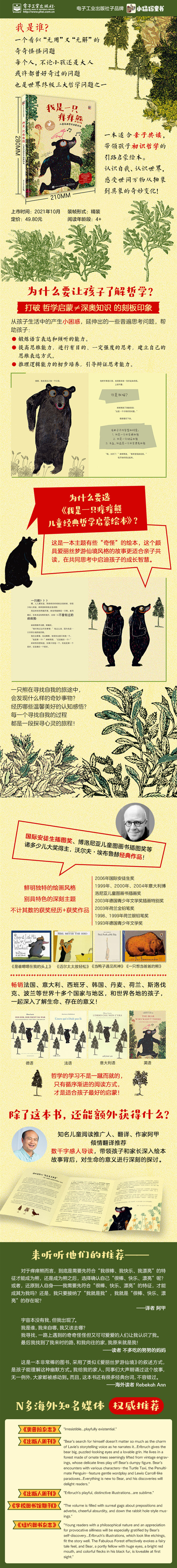 我是谁?这是每个人都曾好奇过的一个问题,这也是哲学三大终极哲学问题之一。一只痒痒熊在寻找自我的旅途中,会发现什么奇妙事情呢?在这本充满哲理的故事中,你会发现,每一个寻找自我的过程,都会是一段探寻心灵的旅程!这是一本初识哲学的引路启蒙绘本,带领孩子认识自我、认识世界,感受抽象到具象的变化。国际安徒生插图奖、博洛尼亚儿童图画书插图奖等诸多少儿大奖得主沃尔夫·埃布鲁赫经典作品!热销法国、意大利、西班牙、韩国、丹麦、荷兰、斯洛伐克、波兰等世界数十个国家!