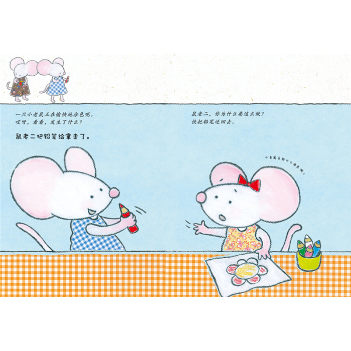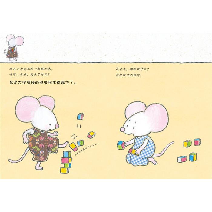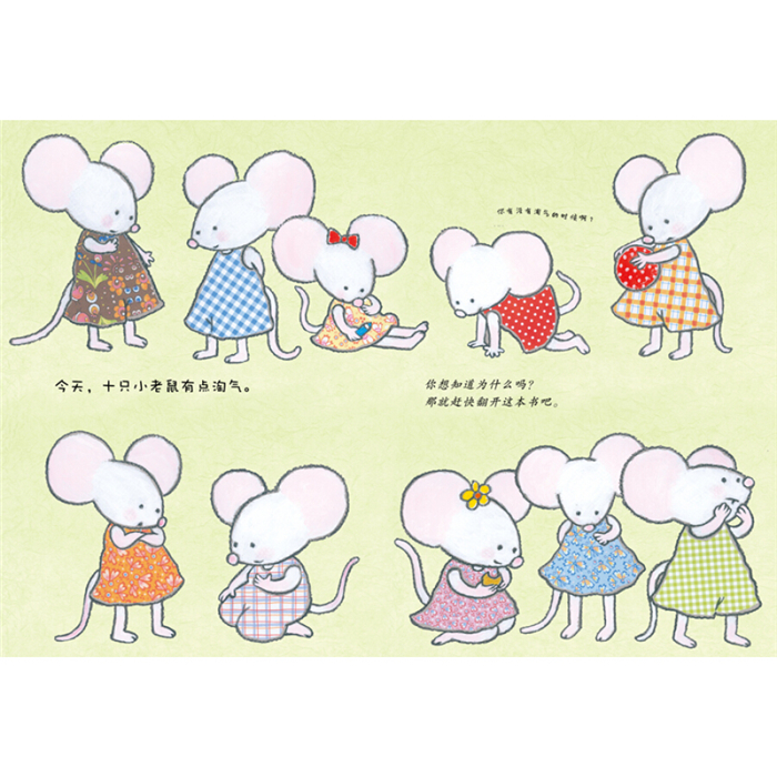 今天,十只小老鼠有点儿淘气。没有一件事是顺顺当当的。每只小老鼠都做了点错事:生气的时候踢东西、画画的时候拿走了别人的铅笔、打碎东西……他们不知道有人正看着他们呢。小老鼠们要怎么做才能弥补他们自己做错的事呢?