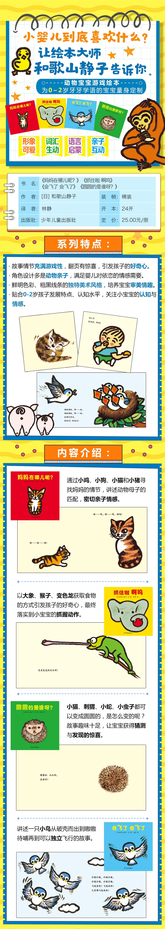 “动物宝宝游戏绘本”系列以生动可爱的动物形象、丰富生动的词汇帮助宝宝认知动物、感知语言,学会观察,并通过轻松有爱的阅读增进亲子间的互动。鲜明色彩、粗黑线条的独特美术风格,培养宝宝审美情趣。