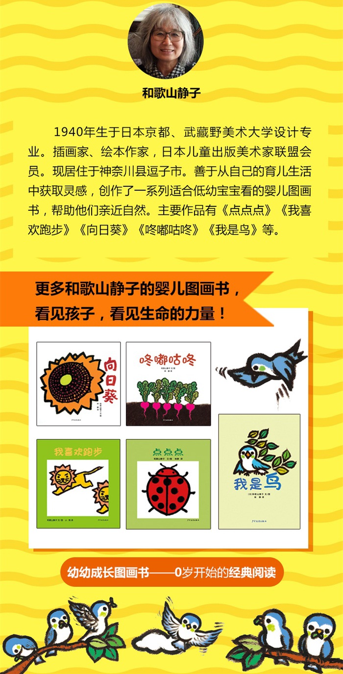 这套低幼绘本的作者是日本著名作家、插画家和歌山静子。说到低幼绘本,看似简单,创作起来并不容易,要想做得好就更难了。它既要考虑低幼宝宝的认知和发展特点,又要在简单得不能再简单、平常得不能再平常的题材中融入童趣和设计,让宝宝不仅能看懂、读起来有趣味,同时还能获得认知的发展。我想,和歌山静子老师正是深谙了其中的奥秘,才会创作出一套又一套让宝宝们百读不厌的低幼绘本。这个奥秘不是简单的经验总结或套路应用,而是作者真正去关注了宝宝,心中住着宝宝,并将这个“宝宝”自然地融入到了书中。