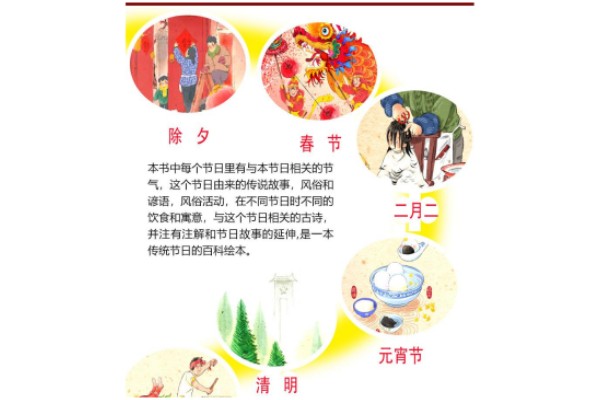 全书共有10个中国的节日故事,采用全手绘展示的中国传统节日场景图画。每个节日的背后都有一段美丽的传说和历史,每个节日里有与节日相关的节气,全书有近300幅精美手绘图画,就像是一幅幅展开的画卷将中国传统节日,民俗风情展现在孩子们的面前。这个节日由来的传说故事,风俗和谚语,风俗活动,在不同节日时不同的饮食和寓意,与这个节日相关的古诗,选自古诗中的名篇,并注有注解和节日故事的延伸。可以说是一本传统节日的百科绘本。 如,为什么清明节要祭祖?为什么祭奠故去的人还要高兴地踏青、放风筝?为什么端午时吃粽子?为什么在中秋节那天赏月,平时不也能看圆月亮吗?