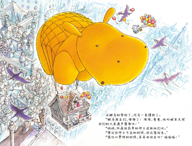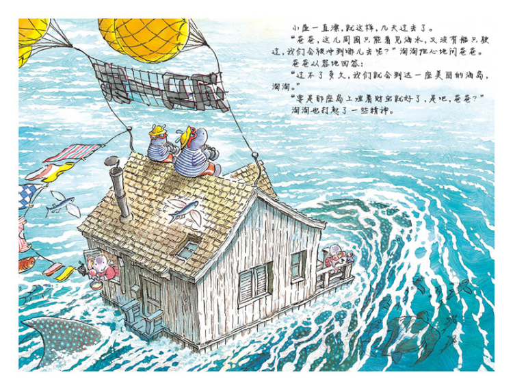 这是一个抚慰人心的家庭冒险故事,向读者传达亲情、友爱、无私和智慧的可贵。即使房子被暴风吹走,即使艰难地在海上漂流,河马一家依然相依相伴,共同克服重重困难,让读者真切感受到亲情的温暖:只要一家人在一起,就一定能看到希望和曙光。同时,本书画风细腻,细节设计巧妙,每一页都能看到一只小企鹅的身影,这也为本书增加了“找找书”功能,增添了几分乐趣。