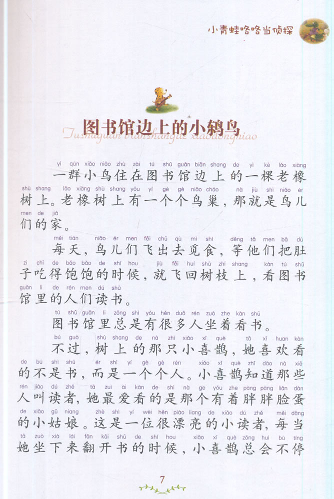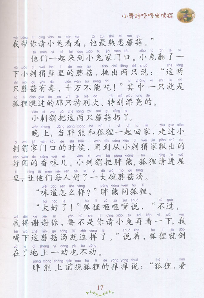 花母鸡丢了一个蛋,她伤心*了,小青蛙略略自告奋勇地去帮助寻找。可是他没有灵敏的鼻子,闻不到小偷的气味儿,他能破案吗?此外,本书中还有小刺猬泥团的故事,小熊黑黑的故事等30余篇故事…… 张秋生编*的《小青蛙咯咯当侦探(注音美绘版)》中有机智勇敢的鱼哥哥,有为他人着想的小松鼠和胖胖鳄鱼,还有谦逊的扁豆藤、扁豆花、扁豆荚……故事精彩好玩,又充满诗请画意。