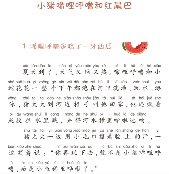 《小猪唏哩呼噜和红尾巴》包含《小猪唏哩呼噜和红尾巴》和《调皮的牙》两个故事。第一个故事中,小表哥红尾巴到唏哩呼噜家做客,核账本、包饺子、扛向日葵,“十项全能”的红尾巴让唏哩呼噜羡慕不已。虽然唏哩呼噜哪个也学不会,但是带着“一个就够”的想法,唏哩呼噜依然乐观、积极地学习与生活。第二个故事中,唏哩呼噜全家在开春时去照全家福,意外地发现猪八姐的嘴有些歪,担心不已的猪八姐陷入忧愁无法自拔,唏哩呼噜和好朋友小狐狸丁丁打算做一个牙套帮助八姐进行矫正治疗。然而没想到的是,猪八姐在吃苹果时机缘巧合地磕掉了一颗“坏牙”,找到了导致嘴歪的“罪魁祸首”。