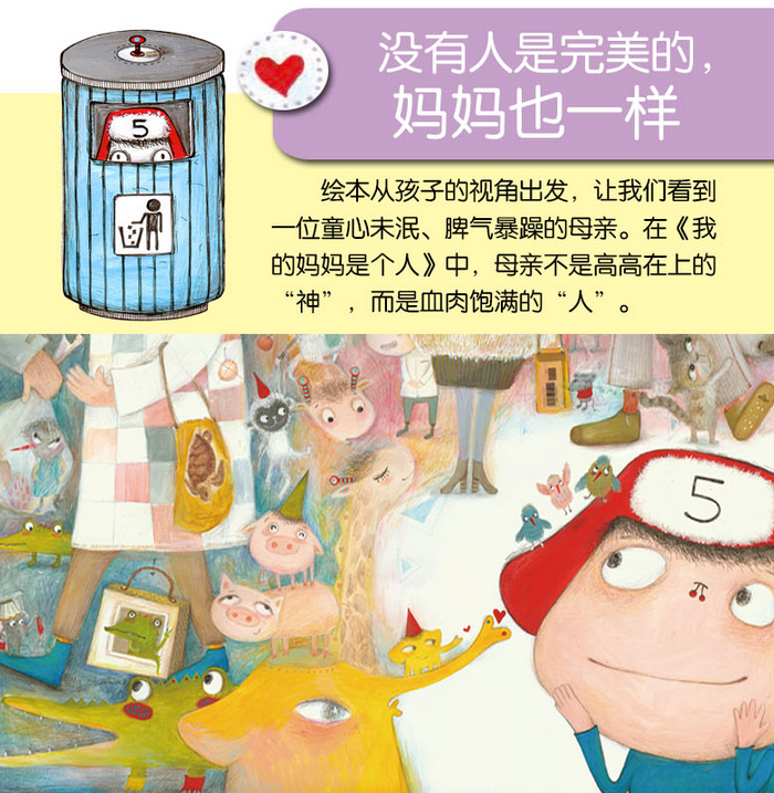 “母爱”一直是文学或艺术作品中经久不衰的主题。绘本《我的妈妈是个人》用俏皮的方式重新诠释了“母爱”的内涵。小五的妈妈不是那种围着孩子打转、颇具自我牺牲精神的传统母亲。她会和孩子抢玩具,会偷吃孩子的零食,甚至也会对孩子大发雷霆。这就是一位平凡的母亲*真实的样子。在绘本里,作者拒绝神化母亲,而是把母亲请下神坛,成为血肉饱满的“人”。 相信每一个看过绘本的孩子,都会对“母爱”有更深的体会。