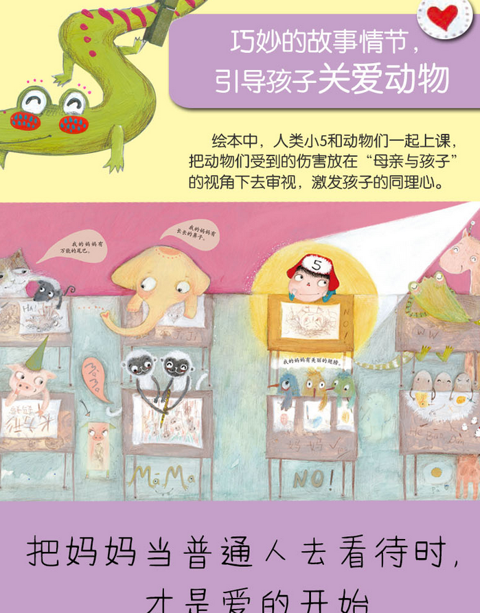 绘本让人类和动物共处一室,一起学习。人类代表小5在课堂上知道了其他动物妈妈奇特的本领,可他觉得自己的妈妈什么都不会,只会生气,可即便这样,小5仍然*爱自己的妈妈,这是为什么呢?绘本形式上采用大书夹小书的形式,意味着妈妈怀抱着宝宝,内容与形式恰到好处的融合。