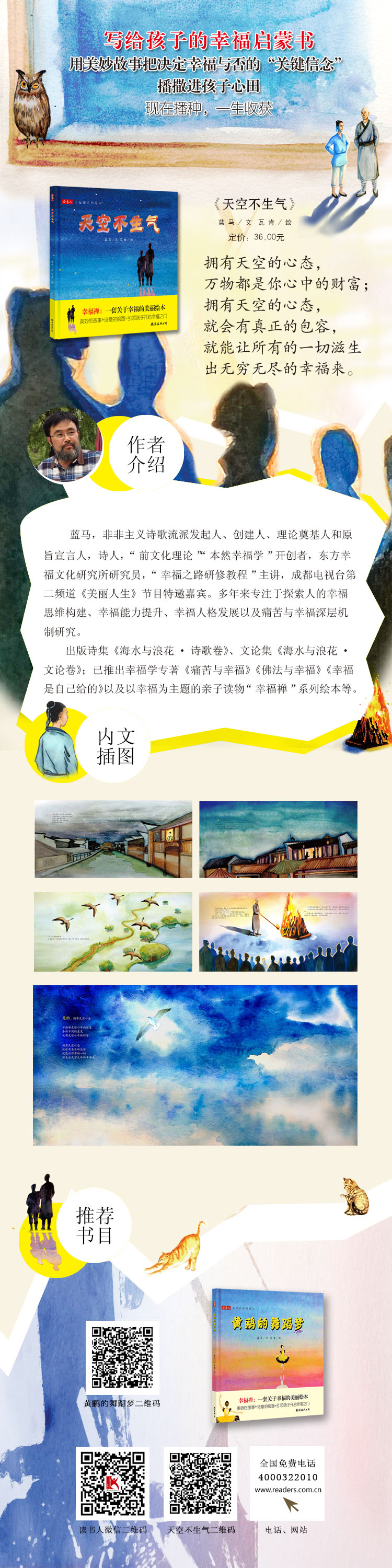 《天空不生气》是由著名幸福学大师蓝马为5-13岁的孩子精心打造的关于“如何感知幸福”的儿童绘本。
