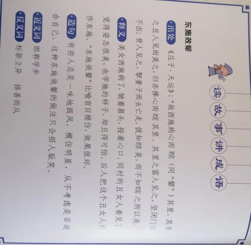 成语故事是我国历史的一部分,成语是历史的积淀,每一个成语的背后都有一个含义深远的故事,是我国几千年以来人民智慧的结晶。阅读成语故事,可以了解历史、通达事理、学习知识、积累优美的语言素材。所以,学习成语是儿童学习中国文化的必经之路。成语故事以深刻形象的故事典故讲述一些道理。成语是我国古代文化园地的一朵奇葩。成语故事绘本是一套图文并茂的读物,精心选择孩子生活中常用的以及各地新版语文教材收录的成语,并据此编撰了完整、生动的小故事,让孩子通过一系列图文并茂的小故事准确地理解成语的意思,把握成语的用法,适合孩子阅读积累,培养儿童良好的传统文化基础。所选成语故事意味隽永,语言优美,但浅显易懂,让儿童在阅读的同时收获感悟。本册为《东施效颦》,比喻模仿别人,不但模仿不好,反而出丑。有时也作自谦之词,表示自己根底差,学别人的长处没有学到家。