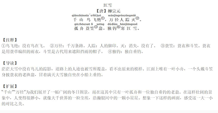 底本采用中华书局精校的通行本。正文原文采用楷体大字,全文注音。每篇诗词附有难字、难词、难句的注释,文采飞扬的大意讲解,并根据《纲要》对不同年龄段学生的要求提出问题,点拨学习要点。