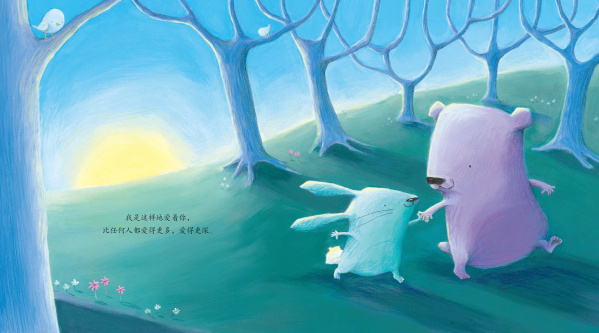 这本书以孩子的视角、浅显童稚的儿童诗形式描述了一只小熊和一只小兔子对彼此深深的爱意。小熊和小兔子手拉着手,在森林中散着步,他们认真而快乐地表达着对彼此的爱。在孩子的眼里,爱并不复杂,它就和我们生活在一起。它存在于在小伙伴之间、存在于母子之间、存在于相爱的人之间……这份爱是这样地真诚浓烈,比其他任何人都爱得更多、更深。倘若比爱之高远,这份爱可以飞向蓝天,飘浮在晴朗的天空。倘若比爱之宽广,这份爱从山这头,一直延续到那头。倘若比爱之深沉,这份爱能深入到海洋的最底端。倘若比爱之宏大,这份爱从快乐的源头一直走到它的尽头。