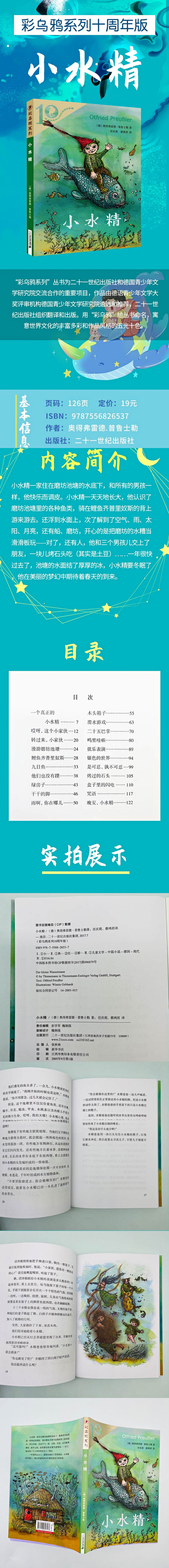小水精一家住在磨坊池塘的水底下,和所有的男孩一样,他快乐而调皮。小水精一天天地长大,他认识了磨坊池塘里的各种鱼类,骑在鲤鱼齐普里奴斯的背上游来游去。还浮到水面上,第一次了解到了空气、雨、太阳、月亮,还有船、磨坊,最开心的是把磨坊的水糟当滑滑板玩——对了,还有人,他和三个男孩儿交上了朋友,一块儿烤石头吃(其实是土豆)……一年很快过去了,池塘的水面结了厚厚的冰,小水精要冬眠了,他在美丽的梦幻中期待着春天的到来。