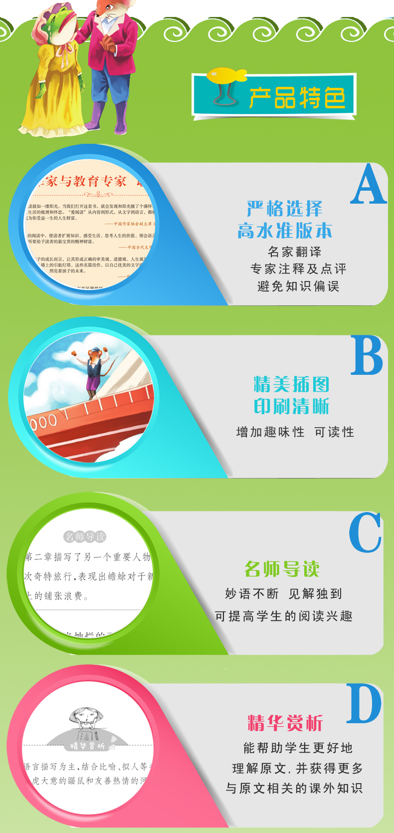 《柳林风声》是以动物为主角的童话,文笔典雅,描写细致,富含哲理。书中塑造了几个可爱的动物形象:胆小怕事但又生性喜欢冒险的鼹鼠,热情好客、充满浪漫情趣的水鼠,侠义十足、具有领袖风范的老獾,喜欢吹牛、炫耀、追求时髦的蛤蟆,敦厚老实的*——他们生活在河岸或大森林里,有乐同享。有难同当。