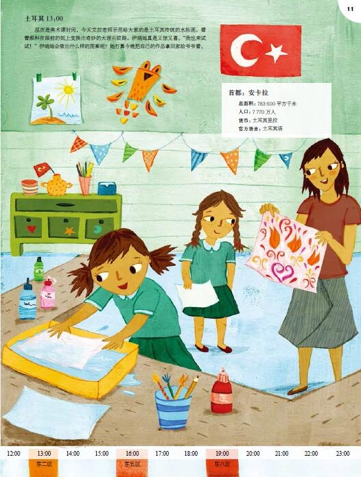 注重细节,便于查阅:每一对开页底部均用不同色块表示的该页小朋友所在的时区及该时区的当地时间,*程度上便于小朋友的阅读和理解。文后还附有“时间”“时区”“小朋友和他们的国家” 等相关知识的延伸。