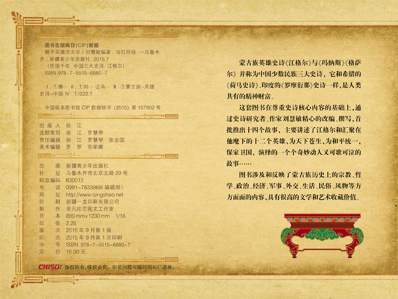 新疆青少社推出具有新疆本土文化特点,表现新疆少数民族传统文化特质的“中国三大史诗江格尔”14本系列绘本图书。作为少数民族三大史诗之一的蒙古族史诗《江格尔》与《玛纳斯》、《格萨尔》并称为中国少数民族三大史诗,它和希腊的《荷马史诗》、印度的《罗摩衍那》史诗一样,是人类共有的精神财富。《江格尔》长期在民间口头流传,青少社将江格尔及其英雄伙伴的故事以鲜活的绘画形式表现出来,能够让孩子从精美的绘本中了解我们中华民族的宏大史诗。绘本主要讲述了江格尔和汇聚在他麾下的十二个英雄,为天下苍生,为和平统一,保家卫国,演绎的一个个奇妙动人又可歌可泣的故事……图书涉及和反映了蒙古族历史上的宗教、哲学、政治、经济、军事、外交、生活、民俗、风物等方方面面的内容,具有很高的文学和艺术收藏价值