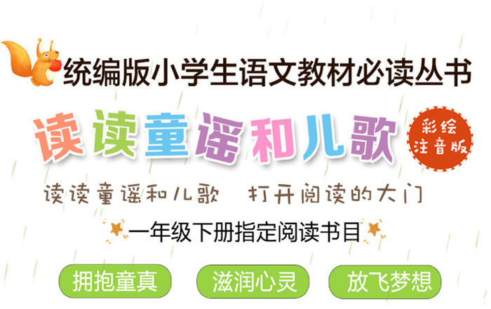“读读童谣和儿歌” 共计4册,根据统编版小学生语文教材要求精选了137首富有童真和智慧的童谣和儿歌在内,并配以童趣十足的精美插图,读来朗朗上口,极富韵味。让孩子通过阅读童谣和儿歌,推开阅读的大门,收获美丽的童年。