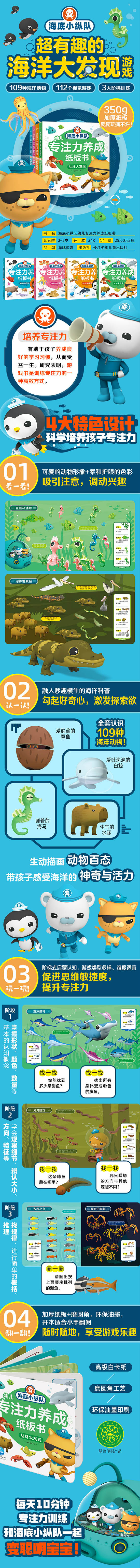 《海底小纵队幼儿专注力养成纸板书》是一套专为2-5岁孩子打造的专注力培养游戏书。书里展示了109种奇特的海洋动物,有112个互动游戏,能同时对孩子进行海洋动物、语言、数学等知识的启蒙,兼具认知力和专注力培养功能,适合反复翻看。 本书有以下四大特色:一、加入了第五季的海洋生物,新鲜有趣。涵盖了中国特有的动物,包括娃娃鱼、扬子鳄等。一套书带孩子认识全球各水域的海洋动物,宝宝可以一边学习海洋知识,一边玩有趣的视觉游戏。二、游戏类型多种多样,包括颜色识别 、形状认知、方向判断、细节辨别、寻找规律等等。满足2-5岁孩子的认知需求,为孩子以后学习打好基础;同时还可以有效锻炼专注力、观察力、思维能力等各大能力。三、采用厚纸板,宝宝撕不烂,可以反复玩。全书圆角模切,适合宝宝小手翻阅,呵护宝宝的安全!四、视觉呈现效果好,可以促进宝宝视觉发育。书中所有图片均源自海底小纵队动画团队,鲜艳的颜色和千变万化的动物造型,对宝宝视觉发育十分有益!