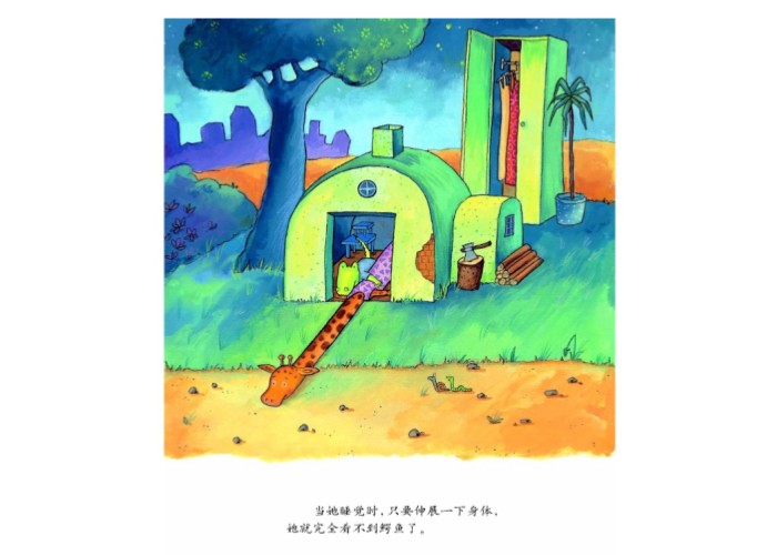 甜蜜的生活开始了,他们不想分开,就想在一起。长颈鹿跟鳄鱼去了他家,鳄鱼家好小哦,长颈鹿只能让自己脖子弯着,扭着,要不,就从门或是烟囱出去,舒展 一下,透透气。鳄鱼很心疼她,不想让她这么辛苦。他们就一起去了长颈鹿的家。但,问题又来了,可怜鳄鱼先生,只能拿着刀叉,看着那高高在上的餐桌发呆。看 着高高在上的马桶,无可奈何。连晾衣服都得爬好高的梯子,鳄鱼先生都学会了走钢丝。长颈鹿又很心疼鳄鱼,不想让他这么辛苦。他们就靠在一起,想啊想。一个 绝好的图纸诞生了,他们开始忙碌起来……