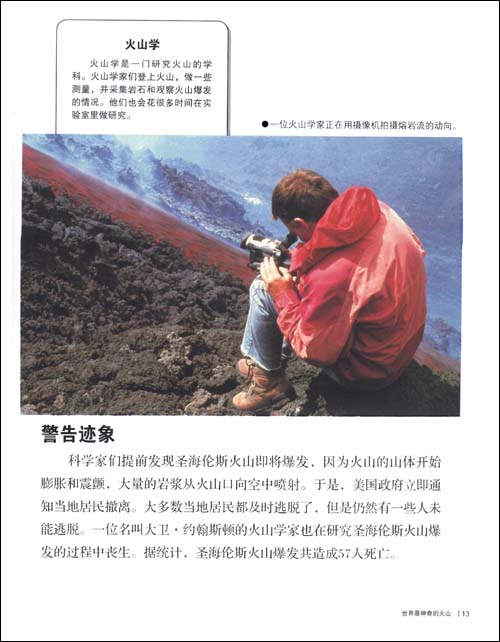 《我们爱地球·世界最神奇的火山》内容简介:世界上有许许多多的火山。有些火山多次爆发,但爆发时温和宁静,岩浆缓缓地沿地壳中的断裂带溢出。也有些火山突然猛烈地爆发。让我们一起来探索这些火山是如何形成的,共同了解火山上的动物和植物,以及生活在火山附近的人们。哪座火山在1860年之前是不准妇女攀登的呢?盾形火山和复合型火山之间的区别是什么呢?哪座火山在1815年爆发时山顶被削去了1000多米?