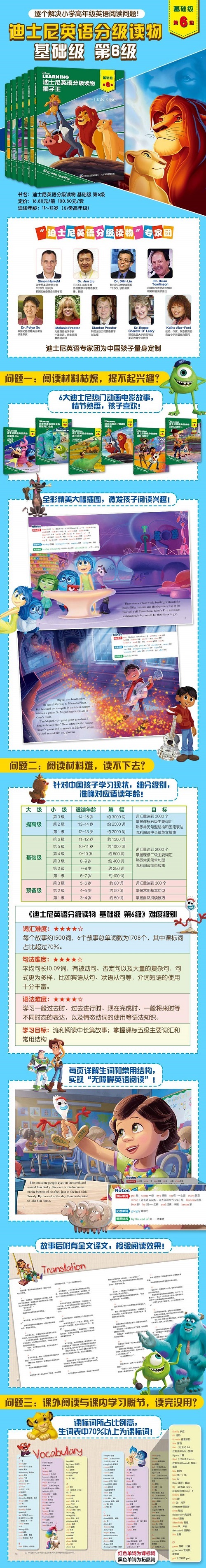 这是一本少儿英语书。故事内容为迪士尼动画片《狮子王》的英文故事。故事讲述了为了继承王位,狮子刀疤设计害死了老狮王,并驱逐了狮王之子辛巴。年幼的辛巴经历了恐惧、孤独、饥渴之后,在朋友的帮助下顺利长大,义无反顾地向刀疤宣战。他能否最终夺回属于自己的王位,成为真正的狮王呢?书中包含解释每页生词的Notes、区分课标词和拓展词的单词表、和每页对应的中文译文,并附有线上“常速版”“跟读版”音频,帮助孩子实现无障碍英语阅读,提升阅读能力。