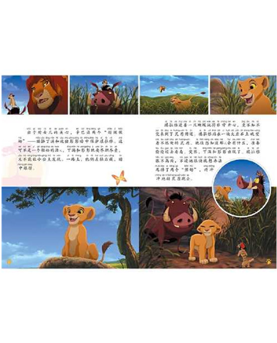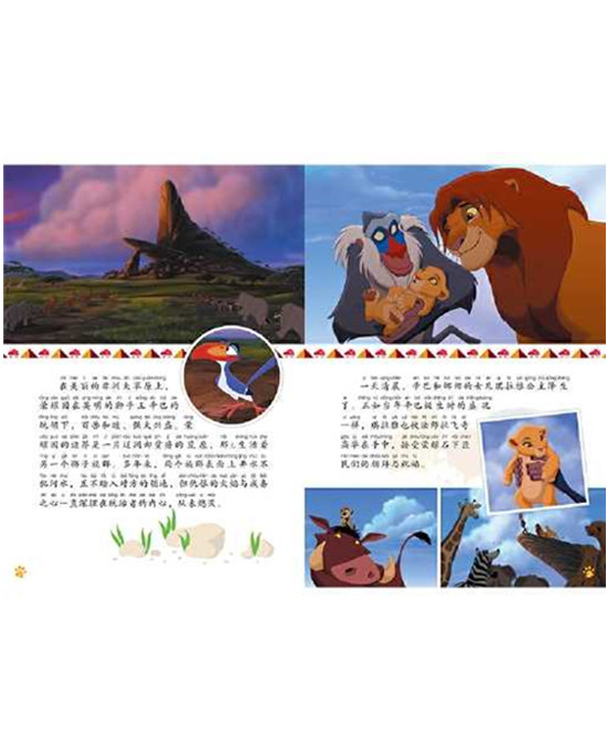 这是一本图画故事书,加注拼音。讲述了刀疤的余党吉娜意图把儿子高孚培养成刀疤的接班人,并蓄谋一场复仇之战,夺取荣耀王国的统治权。不料辛巴的女儿琪拉雅爱上了高孚,在一连串误会中,高孚被辛巴赶出了荣耀国。最终,在琪拉雅的劝说下,上一代的恩怨终于化解,荣耀国也重现了昔日的生机。