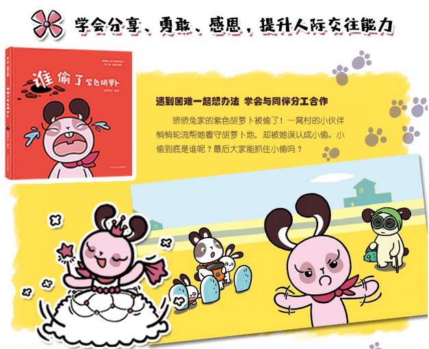 本套书以《3~6岁儿童学习与发展指南》为指导,旨在守护孩子心灵的纯真,积蓄孩子心灵的力量,激发孩子心灵的潜能,提升孩子的品格力、习惯力、情绪力和自我保护能力,让孩子在充满爱的环境中自主成长为一个内心丰富的人。《谁偷了紫色胡萝卜》讲述了分享的故事:骄骄兔家的紫色胡萝卜被偷了!一窝村的小伙伴悄悄轮流帮她看守胡萝卜地,却被她误认为小偷。小偷到底是谁呢?最后大家能抓住小偷吗?