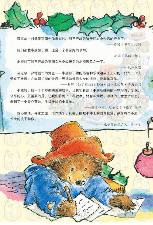 ☆作者迈克尔•邦德说:“帕丁顿永远都不会被打倒或者泄气。他既有孩子的纯真又有大人的沉稳。无限的宽容和爱,永远如孩子一般快乐地生活,是我想传递的价值。”