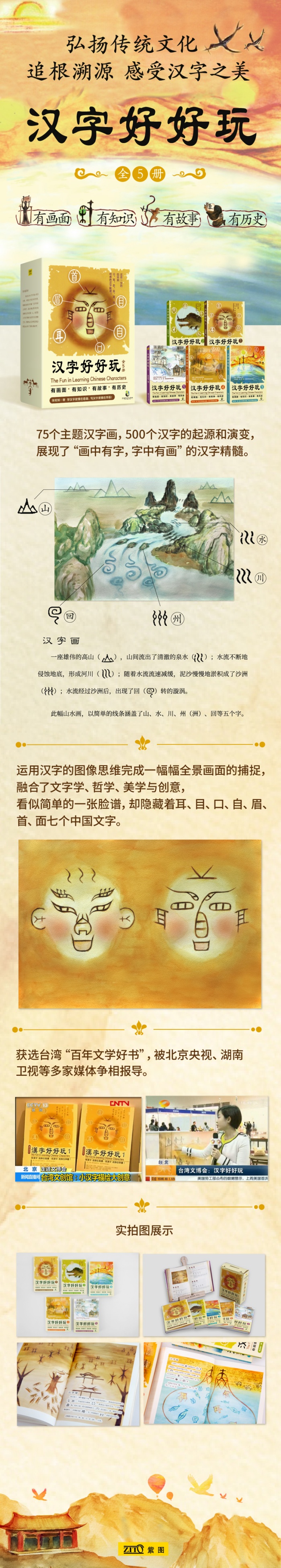 我们从小就学习写汉字,似乎就像呼吸一样自然。当然,难免也会忽略它的美、它的好。汉字达人张宏如精心创作的《汉字好好玩》系列,原创七十五幅汉字画作品,打破传统一笔一画的汉字学习方式,运用汉字的图像思维和我们一起分享汉字学习究竟有多好玩!   展现“画中有字,字中有画”的汉字精髓 ★ 75个主题汉字画,500个汉字的起源和演变 ★ 保留了象形文字的精华,延续了汉字原创的精神 ★ 对象形文字追根溯源,感受文字的真正本质 ★ 揭秘汉字诞生背后有趣的冷知识和真历史 ★ 融合中华文字博大精深的艺术精髓与哲学之美 《汉字好好玩》获选为台湾“百年文学好书”,被北京央视、湖南卫视等多家媒体争相报导。