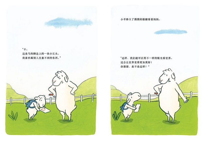 这是一本很“厉害”的书 故事的“线头” 你知道怎么打开裹成一团的毛线球吗?有经验的人会告诉你,先要找到那个小小的线头。找到了它,毛线球就会乖乖地滚动,成为一根顺溜的长线。 所有的故事也都是有“线头”的。图画书的“线头”,往往藏在封面里。 这本书的封面就在眼前。把它和封底连在一起,我们看到了一个安详美好的清新世界。天上几缕淡淡的云,远处几座小山包有着浑圆的轮廓,在一片绿油油的草地上,马儿低着头啃着青草。而画面的主角,明显是封面上的两只羊。小羊宝宝左手举着一张纸,右手攥着一支细细的铅笔。他好像在对妈妈说着什么,妈妈的嘴巴张得老大,一只手似乎在指着自己,神情有些紧张……你一定想问:“咦,为什么妈妈会有这样的反应?”当然,你还看到了这本书的书名《给我画一个小王子》。你由此猜测:小羊是在让妈妈给他画一个小王子吗?那妈妈会不会是在说…… 恭喜你,故事的“线头”被你找到了。是不是迫不及待地想翻开书,解开心中的疑团呢? 小羊的逻辑和妈妈的逻辑 就像你读到的那样,这只小羊正在让妈妈给他画一个小王子。 他为什么要提这个要求呢? 因为他是有自己的逻辑的。 什么是逻辑呢?就是我们想问题、做事情的时候,需要有理由、讲道理。 比方说,如果所有的小羊都能画出一个小王子,那么,这只小羊就应该也能画出一个小王子。可事实是,他画不出来。 那么,这只不会画小王子的小羊,就应该想出一个画出小王子的办法来。 而他想到的办法就是向妈妈求助:“妈妈,请你帮我画一个小王子吧……” 小羊的逻辑是很多小孩的逻辑。我上小学时,爸爸帮我抄过我擦来擦去很多遍也写不好的生字,帮我写过三年级时我无论如何也写不出的篇作文……请注意,我没有说这个逻辑多么正确,只是,它确实是一种常见的小孩的逻辑—遇到困难就去找大人帮忙。 妈妈的惊慌表情也符合逻辑。这个逻辑很“民间”,“龙生龙,凤生凤”,落实到这个故事里,就是羊妈妈满脸无奈地承认:“我呀……我画画可不好。”用生物学的术语,这叫遗传。遗传的力量真强大,双眼皮遗传,画画不好也遗传。 妈妈也不会画小王子,怎么办?按照小羊的逻辑,画画这件事是没戏了。 这个世界有趣的地方就在于,它总会有峰回路转、柳暗花明。走进死胡同的时候,我们缺少的,有时只是一个新逻辑。 羊妈妈说:“我们来画一些没有人画过的东西,不是更好玩吗?”她的逻辑是:为什么一定要画得和别人一样? 于是,她果真画出了一个……别急着往下读故事,先猜猜看,她画的是什么?答案在封底的那张大图里。你要是猜准了,我只能说,你真的很厉害! 什么是“厉害” 故事的后来,所有的小羊都赞叹:“哇!你的妈妈太厉害了!” 后来的后来,所有的小羊都赞叹:“哇!这……这真是比‘厉害’还要厉害呀!” 究竟是什么那么“厉害”?“厉害”的逻辑又是什么呢?来,我们来讨论讨论。 你说,是像羊妈妈一样画别人注意不到的东西吗? 嗯,这是“厉害”!有羊妈妈这么一提醒,大家都知道了,原来世界上有这么多东西可以画,我们之前怎么都没有注意过呢?“厉害”的人能让大家的眼睛看到更多的东西。 你说,是像小羊那样画出自己想象的东西吗?嗯,这的确“厉害”!谁说不是呢,既然桌子、椅子、小石子都可以画,那么自己想象出的东西为什么不可以画呢?“厉害”是想象、创造、别出心裁、与众不同……你们说得都很好,跟你们一样在阅读的我,忽然脑子里蹦出了一些新的逻辑,你们也听听好吗? 有时候,画得出是“厉害”的,画不出也是“厉害”的。画不出的“厉害”在于,承认别人画得出的东西自己确实画不出,然后尽力画一个自己能画得出的东西,哪怕像小羊那样只能画个“0”—画出“0”本身已经“厉害”,“0”是所有数目的起点,没有不起眼的“0”,哪里有后面那些荣耀十足的“90”和“100”?是不是可以这样说,很多今天的“不厉害”,明天、后天,很多天过去后,慢慢会长成“厉害”,这是“厉害”的“成长逻辑”。 就算连“0”也画不出来,也可以是“厉害”的。世界上有无数个你,这个你可能会唱歌,那个你可能会游泳,另一个你可能会编故事……为什么一定要画画?无数的人就有无数的可能性,无数的可能性不就包含着无数的“厉害”吗?这是“厉害”的“可能性逻辑”。 也许,小孩的“厉害”跟大人的“厉害”之间有些关系。当小羊垂头丧气的时候,如果不是妈妈告诉他不需要和别人画得一样,可怜的小羊怎么能转过弯来?如果不是妈妈理直气壮地画了一块再简单不过的小石头,他又怎么会鼓起勇气去画歪歪扭扭的“0”,又怎么会成为充满自信的“画画的小王子”?看来,要想让小朋友“厉害”起来,大人应该做的是启发,是示范。能给孩子做榜样的大人才真的“厉害”! 一本书能让人浮想联翩,它的作者真的很“厉害”。多读读这样“厉害”的书,我们也会渐渐“厉害”起来的。阅读,让人越来越“厉害”! ——南京市玄武区教师发展中心语文教研员 黄雅芸