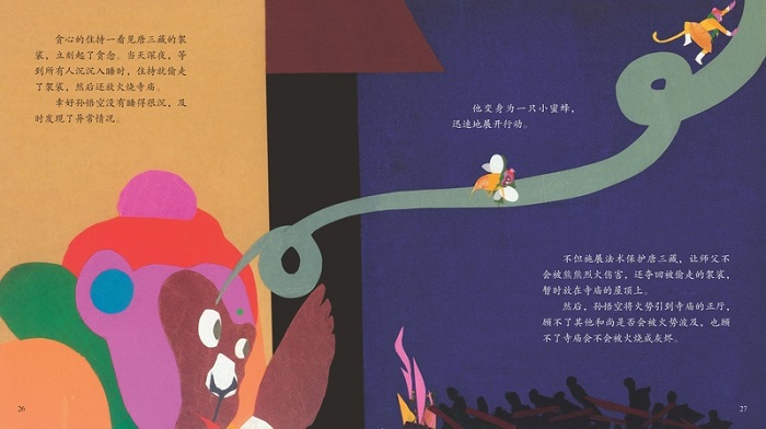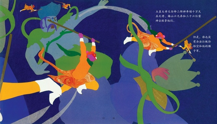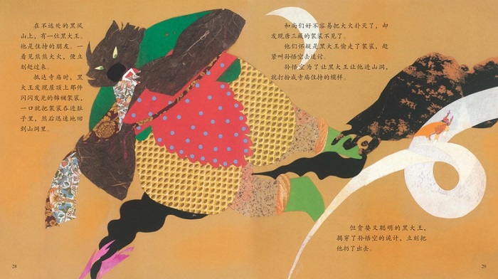 不同于《生肖鼠的故事》的水墨重彩和《塞翁失马》的写意工笔,这本《美猴王孙悟空》的插画是以剪纸绘画和布艺拼贴的艺术形式,配合杨志成先生简洁生动的叙述语言,为孩子们再现了精彩的故事情节和奇幻的场景布置。