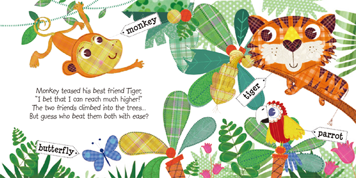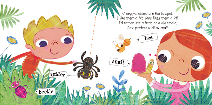 一起来教小朋友认识动物吧! 大动物,小动物,家养宠物,野生动物,水生动物,森林动物,沙漠动物,昆虫… 小朋友们,准备好探索动物世界了吗? 趣味性十足——每一页都用朗朗上口的诗歌式押韵语句来引出不同的动物,小朋友还可以随着家长一起大声朗读。 动物分类明确——每一幅插画都是引人入胜的人物和动物场景,沙漠场景,夜晚场景…动物们就隐藏在一幅幅插画里,小朋友们可以边找边读边学习动物的特性。 五十多种不同的动物,分别标注对应的单词,一起来学习吧。