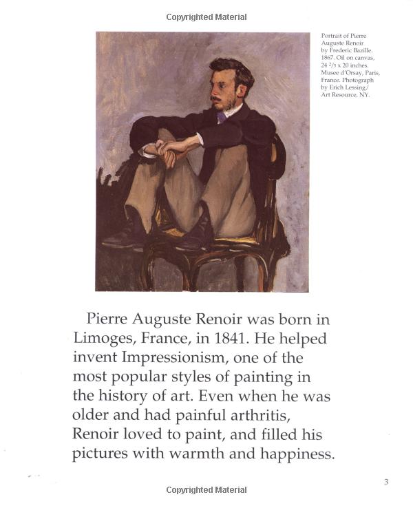 Clever illustrations and story lines, together with full-color reproductions of Pierre Auguste Renoir's actual works, give children a light yet realistic overview of this artist's life and style.