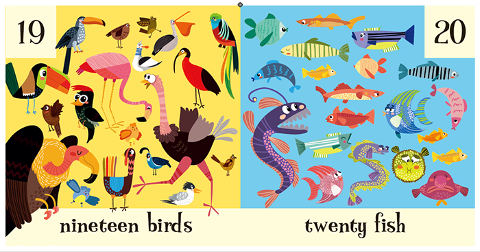 从one到twenty,每个数字配有一种动物,且配有相应数字的个数,每个动物又有不同的形态,可以让小朋友有感性的认识数字,以及数字所代表的意义。书最后配有练习题,让小朋友在整页画面中寻找相应数字的动物,训练小朋友的观察力和专注力。