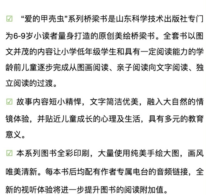 本丛书包括《早安,猫骑士》《女巫口袋里的鱼》《鳄鱼的大嘴巴》《兔子安菲特的捕梦网》《爱上一棵树》《蓝色麦田》。该套图书封面与勒口处设计二维码,扫描即可听到童音内容,读者对象6~9岁儿童。手绘插图互动游戏原创文字;全能力培养:想象力认知力观察力动手力;全方位启智:美育、德育、智育