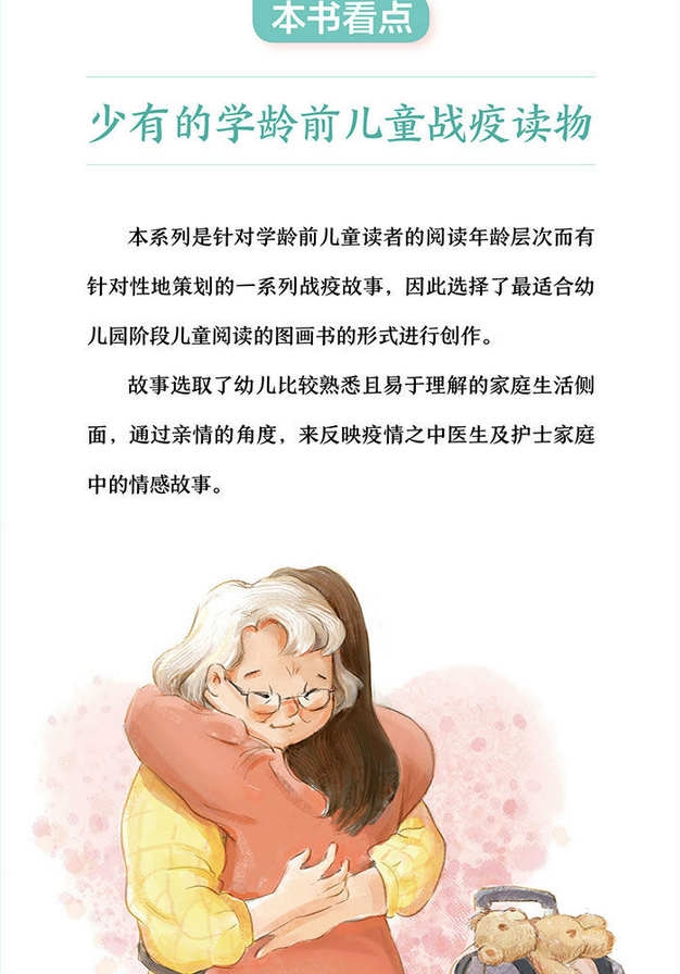 讲述了小主人公向外婆隐瞒自己的护士妈妈在武汉抗击新冠病毒肺炎疫情一线奋战的故事,选题歌颂了在新冠病毒肺炎疫情到来时,广大医护人员奋战在前线的英雄主义精神,树立了医护工作者们充满社会责任和担当的勇往直前的逆行者形象,用儿童喜爱的绘本形式描写了医护家庭中,温暖的亲情与充满爱的支持。