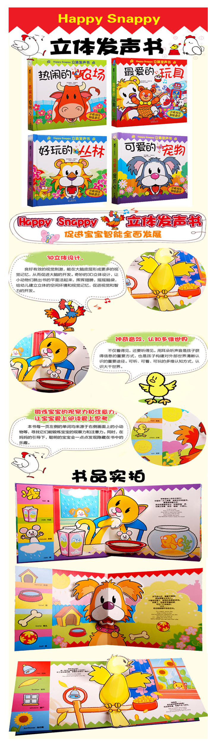 ●Happy Snappy系列,全球销量超1300 有没有想过各种不同动物都有什么叫声呢?我们教会了孩子认识许许多多的可爱动物,可是孩子们连各种小动物的声音都没有听过,是不是有些遗憾呢?小宝宝与动物有种天生的亲近感,他们喜欢小动物,喜欢认识它们,可是在钢筋水泥的城市中小宝贝与动物又有多少接触的机会呢,现在让孩子认识这些可爱的动物,听听它们的声音,看它们一个个跳出书的平面和宝贝做朋友吧!?