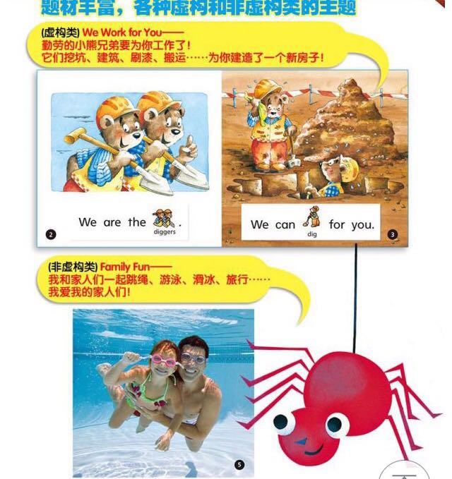 超 过10个单词,文字押韵,节奏性强,并且不断重复,符合孩子的认知规律。同时配以精美图片进行解读。让孩子们在阅读开始时不会感觉到困难,从而增强阅读的成就感,培养阅读的兴趣。