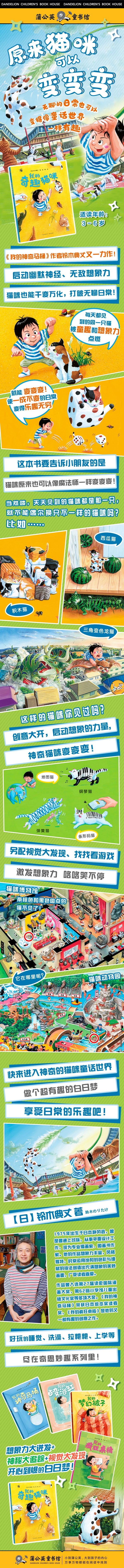 这本书告诉小朋友的是再寻常不过的猫咪原来可以变得超级有趣,使每天都精彩无限! 哦,是吗?猫咪不是一直都一个样吗?怎么会变得超有趣呢? 本书延续《我的神奇马桶》系列图画书幽默、想象力爆棚的风格,把每天都见到的猫咪千变万化,变成了各种各样的猫咪,比如小岛猫、西瓜猫、方块猫、透明猫……咦?猫咪不见了!它跑哪儿去了?快来找找看吧! 想象力无敌,开心到爆,还有神秘大追踪,视觉大发现!快来一起进入神奇的猫咪世界,做个超有趣的白日梦吧!