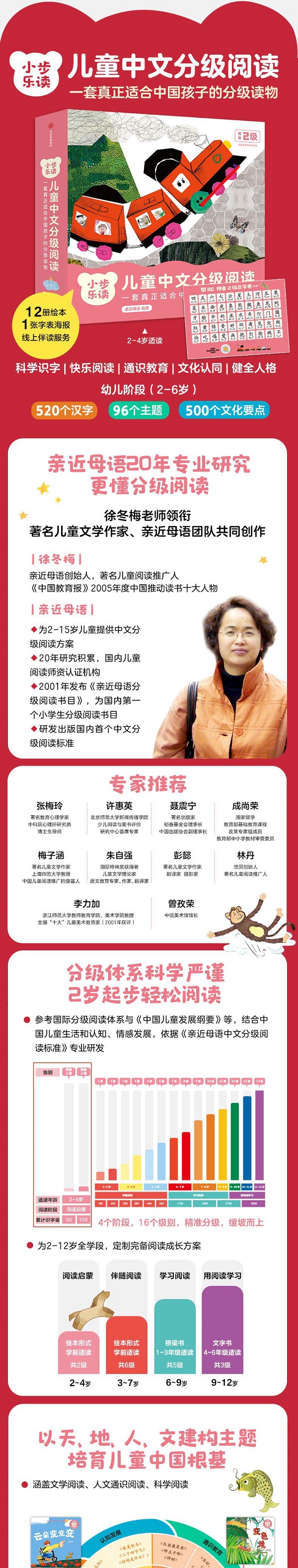 ★这是一套真正适合中国孩子的分级读物。 ★亲近母语20余年研究与探索的匠心之作。 ★科学识字、快乐阅读、通识教育、文化认同、人格养成,助力儿童全面发展。 这套书是《“小步乐读”儿童中文分级阅读》项目的“预备2级”,共12册,适合2~4岁孩子阅读。 内容是绘本形式,主题丰富,涉及天文、自然、岁时、山河、草木、鸟兽、身心、人家、家国,以及童谣、中国传统故事等。旨在进行阅读启蒙,符合2~4岁儿童认知、情感、语言和发展特点。 文本内容兼顾认知、文学、人文和科学,配套线上、线下资源丰富多彩,配有字表海报、朗读音频资源、专家阅读指导视频、家长阅读手册、线上阅读能力测评等,帮助孩子快乐识字,爱上阅读。