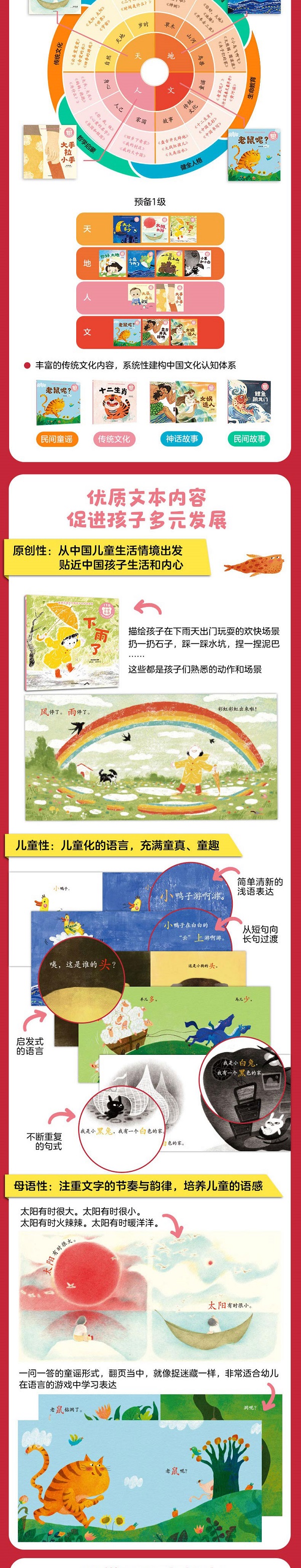 ★这是一套真正适合中国孩子的分级读物。 ★亲近母语20余年研究与探索的匠心之作。 ★科学识字、快乐阅读、通识教育、文化认同、人格养成,助力儿童全面发展。 这套书是《“小步乐读”儿童中文分级阅读》项目的“预备1级”,共12册,适合2~4岁孩子阅读。 内容是绘本形式,主题丰富,涉及天文、自然、岁时、山河、草木、鸟兽、身心、人家、家国,以及童谣、中国传统故事等。旨在进行阅读启蒙,符合2~4岁儿童认知、情感、语言和发展特点。 文本内容兼顾认知、文学、人文和科学,配套线上、线下资源丰富多彩,配有字表海报、朗读音频资源、专家阅读指导视频、家长阅读手册、线上阅读能力测评等,帮助孩子快乐识字,爱上阅读。