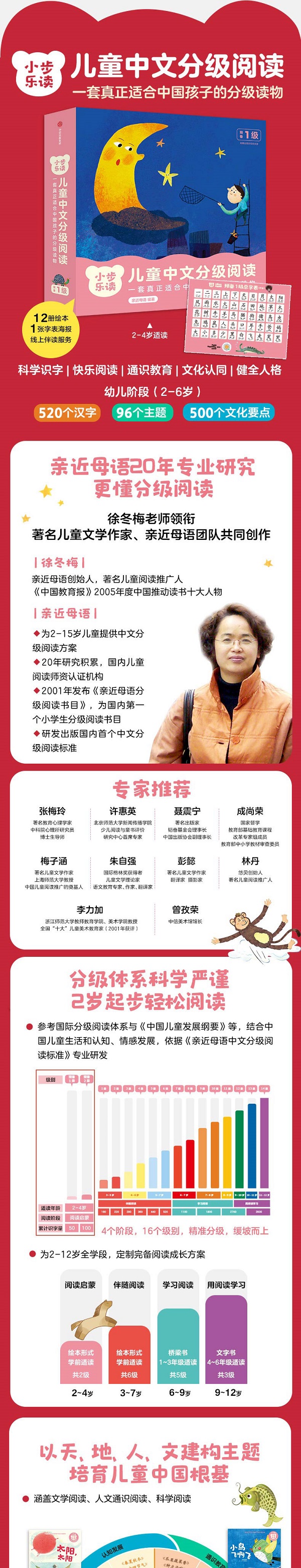 ★这是一套真正适合中国孩子的分级读物。 ★亲近母语20余年研究与探索的匠心之作。 ★科学识字、快乐阅读、通识教育、文化认同、人格养成,助力儿童全面发展。 这套书是《“小步乐读”儿童中文分级阅读》项目的“预备1级”,共12册,适合2~4岁孩子阅读。 内容是绘本形式,主题丰富,涉及天文、自然、岁时、山河、草木、鸟兽、身心、人家、家国,以及童谣、中国传统故事等。旨在进行阅读启蒙,符合2~4岁儿童认知、情感、语言和发展特点。 文本内容兼顾认知、文学、人文和科学,配套线上、线下资源丰富多彩,配有字表海报、朗读音频资源、专家阅读指导视频、家长阅读手册、线上阅读能力测评等,帮助孩子快乐识字,爱上阅读。