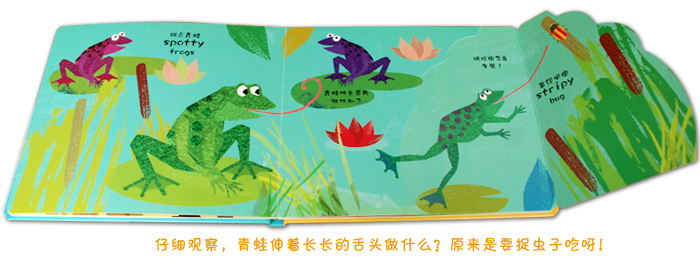 《条纹斑点好美丽》老虎身上是条纹状的,美洲豹身上有漂亮的斑点,大自然里还有好多的动物都有条纹和斑点,你都认识它们吗?看斑点狗们冲到了树下,它们在看什么呢,原来是一只可怜的条纹猫,它要怎么从树上下来呢;毛毛虫身上有五颜六色的条纹,那么毛毛虫长大了会变成什么样呢;斑马先生有着漂亮的黑白条纹,它的好朋友长颈鹿先生又有着怎样的图案呢? 这是一套创意独特的认知翻翻书,可爱的动物们是书中的主角,是它们带领着孩子走进动物的世界寻找、发现和学习。每一页的画面里都隐藏了许多动物,需要你动动手发现它们。